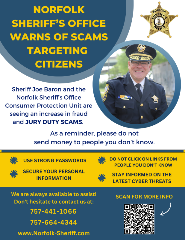 As a reminder, the Norfolk Sheriff's Office will NEVER call asking for money over the phone and correspondence regarding jury duty is always done in person through deputies or through a summons posted on residential doors. Additionally, we will NEVER call and tell someone there is a warrant for their arrest.