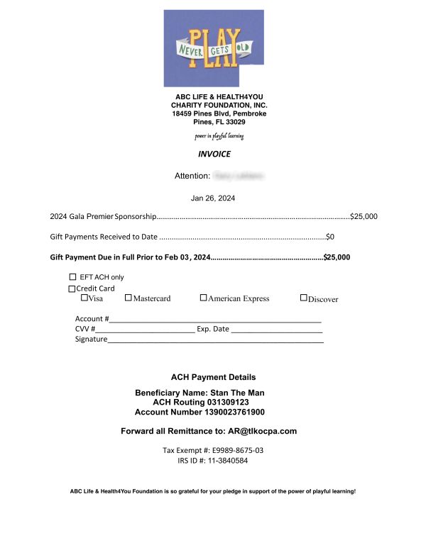 The “Pledge Invoice” shown here provides banking transfer information as well as some “legitimacy” by showing IRS numbers and the like.